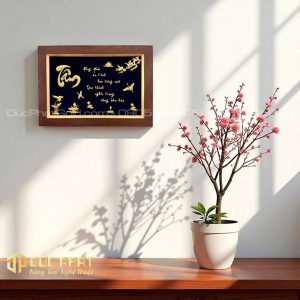 - Nền tranh màu xanh đen tượng trưng cho sự tĩnh lặng và chiều sâu của tâm hồn, làm nền hoàn hảo cho sắc vàng rực rỡ của chữ thư pháp và các họa tiết.