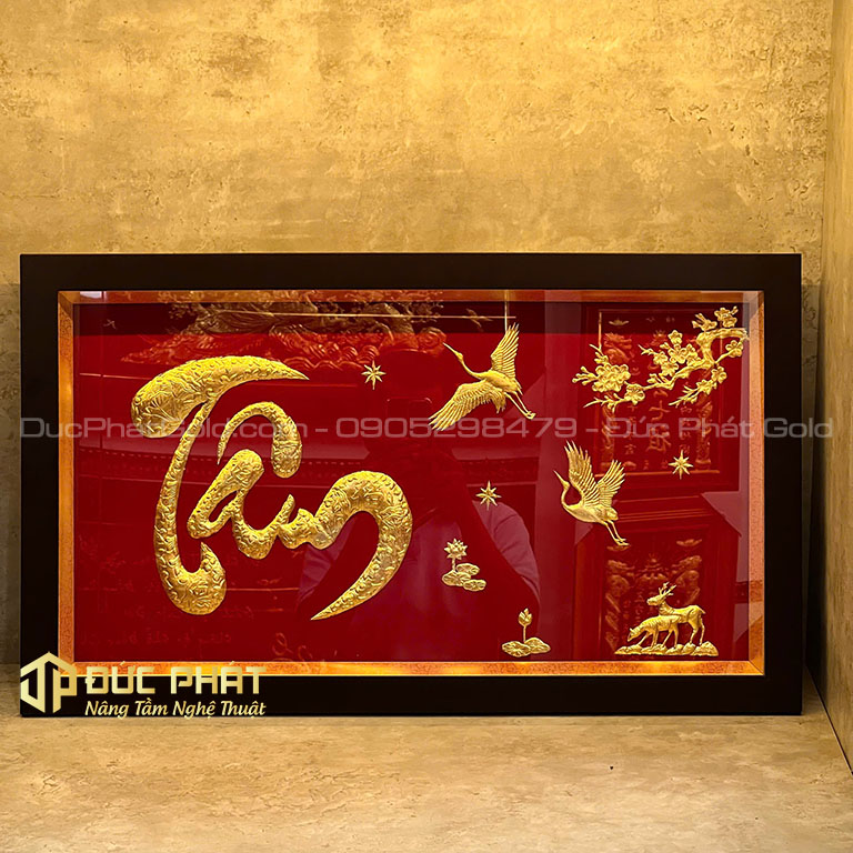 Bức tranh nổi bật với nền đỏ quyền quý, chữ dát vàng lấp lánh và những chi tiết được chế tác tinh xảo. Màu đỏ tượng trưng cho may mắn, tài lộc; màu vàng biểu trưng cho sự cao quý và trường tồn. Treo tranh trong không gian sống hay làm việc sẽ: