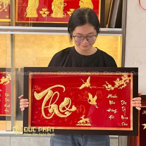 Bức tranh chữ Thọ dát vàng được chế tác thủ công bởi những nghệ nhân lành nghề, kết hợp kỹ thuật tạo hình nổi với lớp dát vàng sang trọng. Từng đường nét được khắc chạm tinh tế, từ chữ thư pháp uyển chuyển đến đôi chim Hạc mềm mại, tạo nên hiệu ứng ánh sáng lung linh trên nền đỏ rực rỡ.