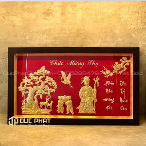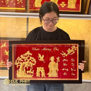 Bức tranh Chúc Mừng Thọ Cụ Bà dát vàng là sản phẩm của Đức Phát Gold. Sản phẩm được thiết kế tinh xảo và do nghệ nhân lành nghề trực tiếp chế tác với chất liệu cao cấp giúp bức tranh vừa giàu ý nghĩa, vừa bền đẹp với thời gian để lưu giữ kỷ niệm. Có thể nói đây là lựa chọn hoàn hảo cho các dịp sinh nhật, mừng thọ 60, 70, 80, 90, 100 tuổi và lễ tết.