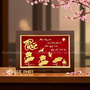 Chữ Phúc trong tranh được Đức Phát Gold thể hiện bằng phong cách thư pháp bay bổng, dát vàng nổi tinh tế. Từng đường nét uốn lượn mềm mại mà mạnh mẽ, như dòng chảy của phúc khí lan tỏa khắp không gian. Khi ánh sáng chiếu qua, chữ Phúc ánh lên sắc vàng ấm áp, tượng trưng cho niềm vui, hạnh phúc và sự viên mãn.