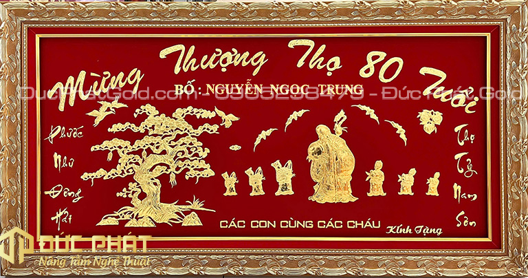 Với sự hòa quyện giữa ý nghĩa nhân văn, giá trị nghệ thuật và tính cá nhân hóa, tranh mừng Thọ cụ ông 80 tuổi chế tác riêng của Đức Phát Gold chính là món quà trọn vẹn để tôn vinh bậc trưởng lão trong ngày đại lễ. Đây không chỉ là lời chúc thọ cao quý, mà còn là minh chứng cho tình cảm hiếu kính và sự trân trọng của con cháu đối với công lao sinh thành.